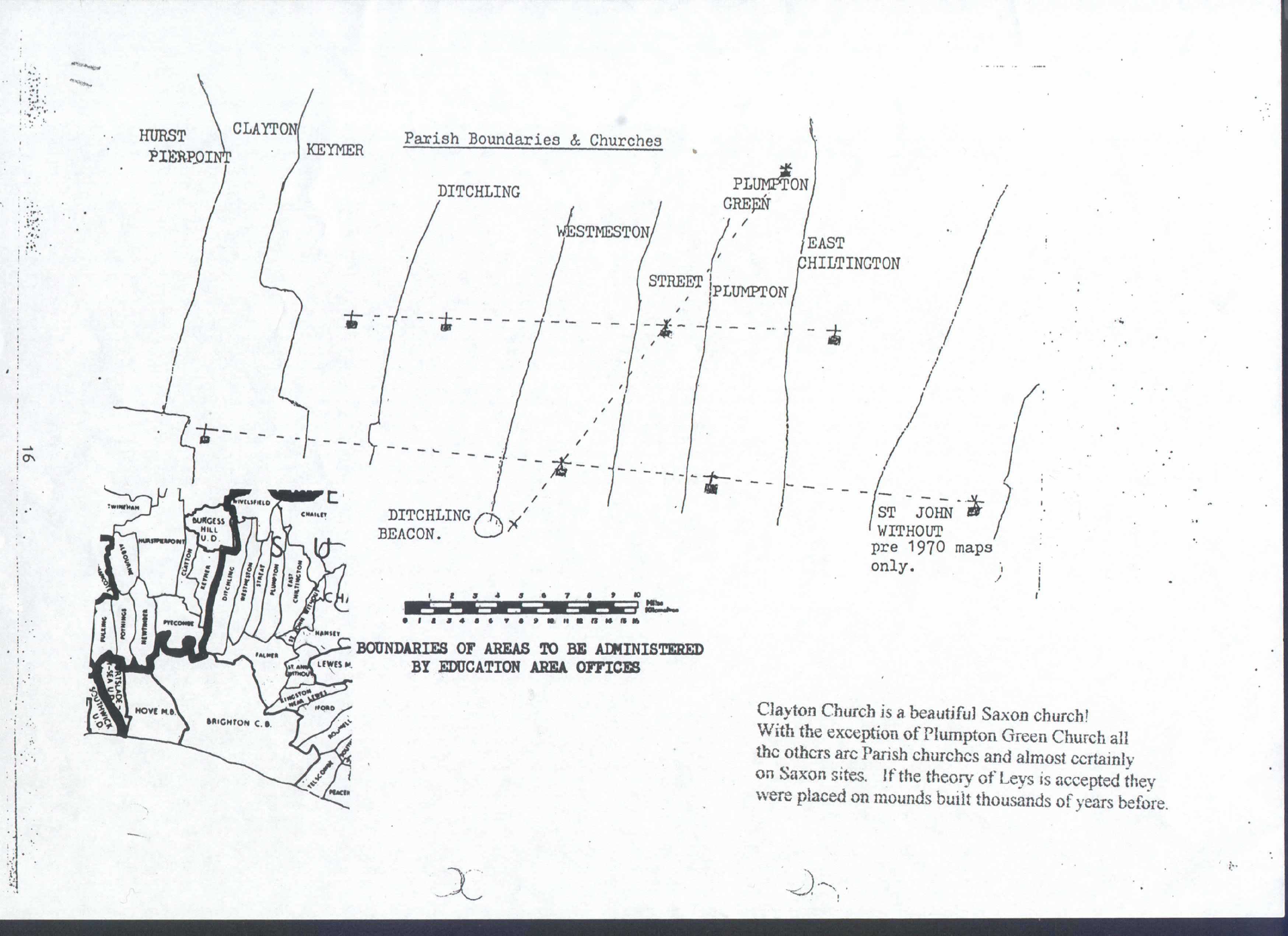 When it was seen that the Turnpike “New Roads” were the same age for both Hurstpierpoint “New Roads” and the Clayton to Ditchling “New Road” it was clear that they were all pre-Roman. Do the Leys have something in common with the “New Roads”? There are 3 straight sections, one in Ditchling, one in Keymer and the third in Clayton. The Ditchling section points to Clayton Church. The Clayton section can be viewed from the “dewpond” on Wolstonbury Hill as a straight line. The middle section of Keymer points to a spot where three other lines converge.